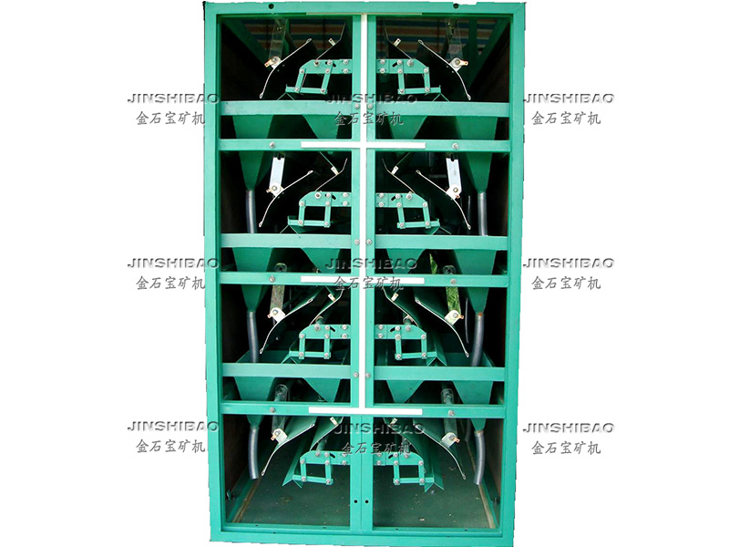 本機(jī)采用雙排四層結(jié)構(gòu),每層都有接地弧形溜板(無(wú)銹鋼制),其上部安裝一弧狀帶高壓靜電板(鋁板制),此電極板固定不動(dòng)(但可調(diào)),在接通高壓靜電后,礦物經(jīng)下礦板溜至接地弧板進(jìn)入高壓電場(chǎng)區(qū),導(dǎo)電礦物被感應(yīng)而帶電,吸向電極,但由于受到重力作用,故它的運(yùn)動(dòng)軌跡不同于非導(dǎo)體礦而從前方排出,非導(dǎo)體礦也受到電場(chǎng)作用,但不會(huì)被吸引而進(jìn)入下層再分選,復(fù)選四次直至礦產(chǎn)品合格。